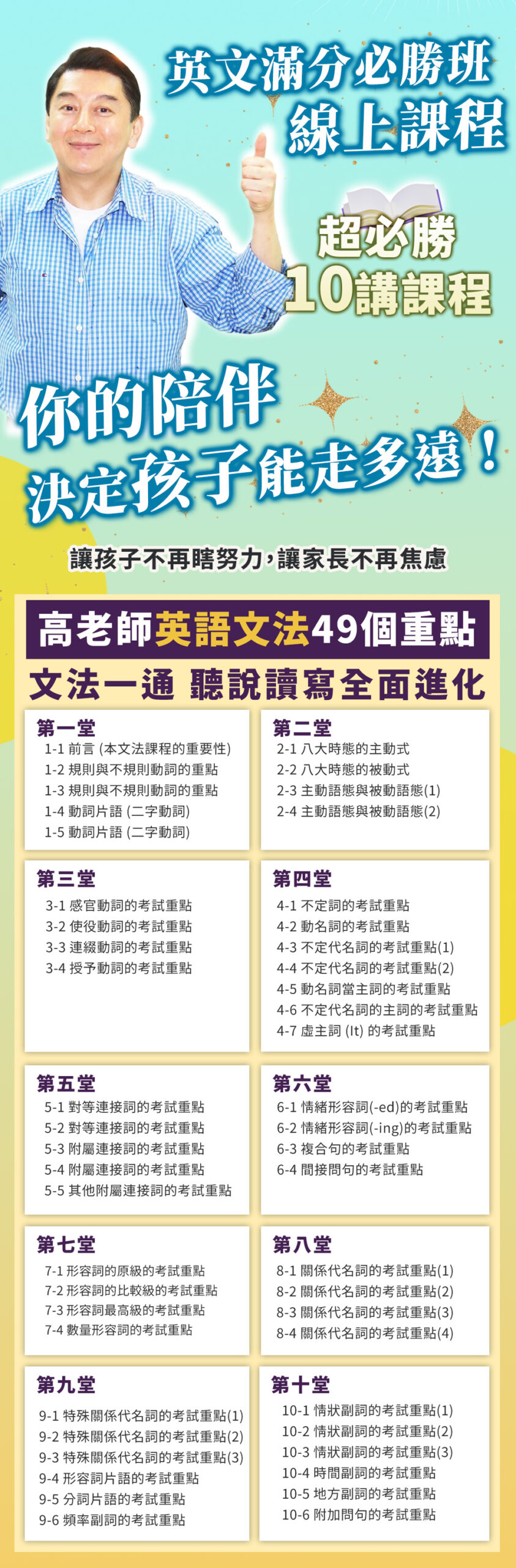 1. 快速上手,英文文法必勝技巧2. 線上課程,不需到補習班上課3. 在家學習,可反覆回看和複習4. 王牌名師,課程內容生動高校5. 恢復自信,重拾對英文的自信